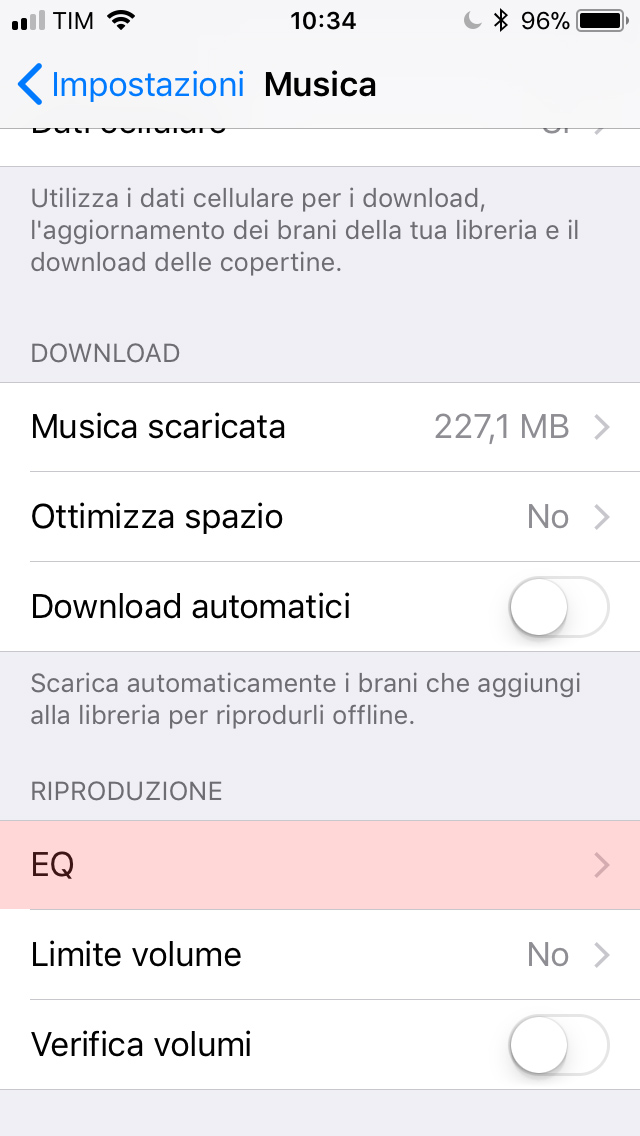 Prima di tutto entriamo nelle Impostazioni, qui scrolliamo verso il basso e premiamo su Musica. Adesso, nella sezione Riproduzione, scegliamo EQ e nella schermata che si apre andiamo a selezionare la voce Notte fonda.