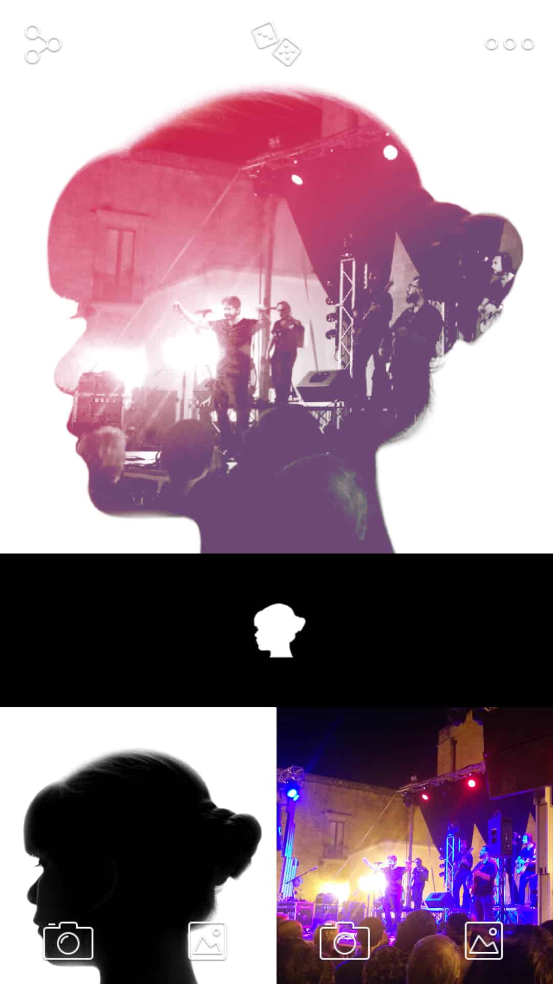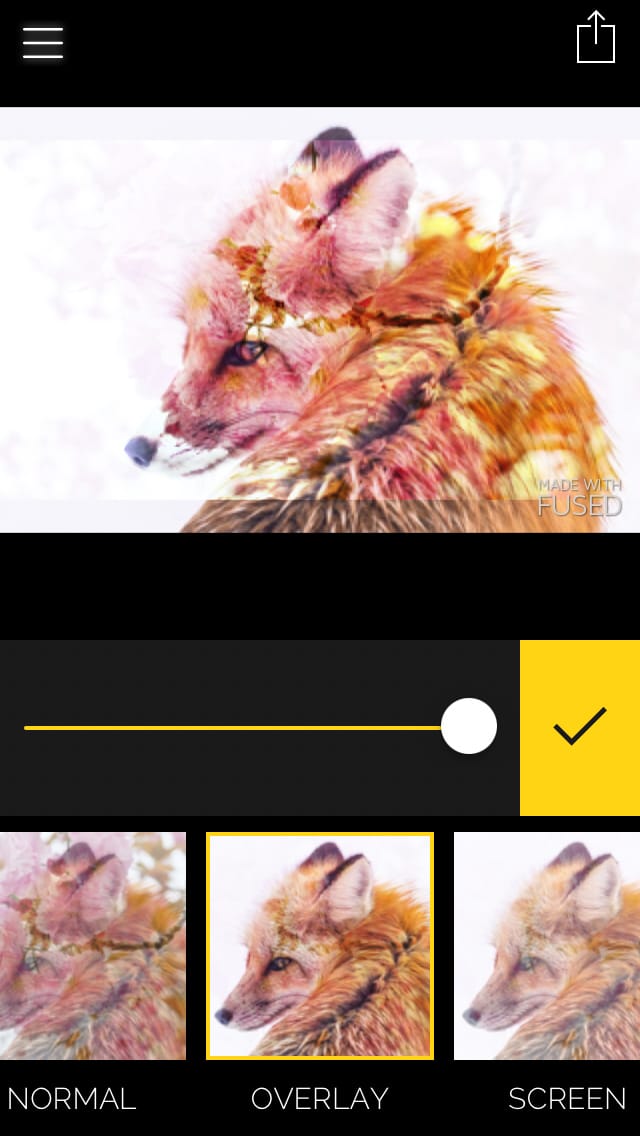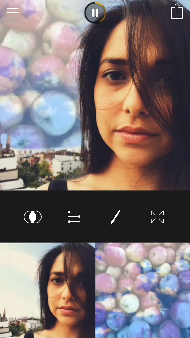 L’applicazione che ho scelto per chi possiede un iPhone è praticamente identica a Diana, con il plus di poter unire fra loro anche video!. Quest’app si chiama Fused e presenta un’interfaccia simile a Diana, in alto l’anteprima e in basso le immagini (e i video) che abbiamo utilizzato per creare la doppia esposizione. Diversamente dall’altra applicazione Fused permette di modificare l’immagine finale tramite alcuni settaggi come la trasparenza dell’immagine sovrapposta, e non tramite filtri.