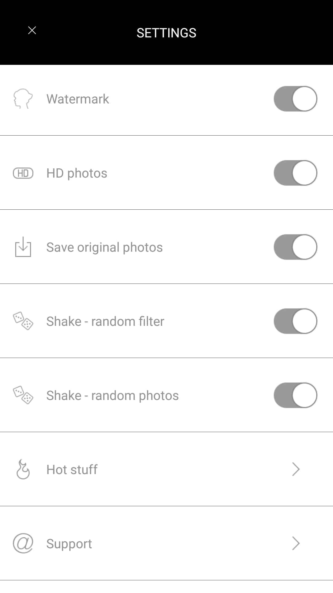 Qui prima di condividere la foto sui social network (il formato delle immagini è molto adatto ad Instagram) possiamo applicare vari filtri facendo uno swipe orizzontale sull’anteprima; è possibile inoltre combinare in maniera casuale fotografie e filtri premendo sull’icona dei dadi.