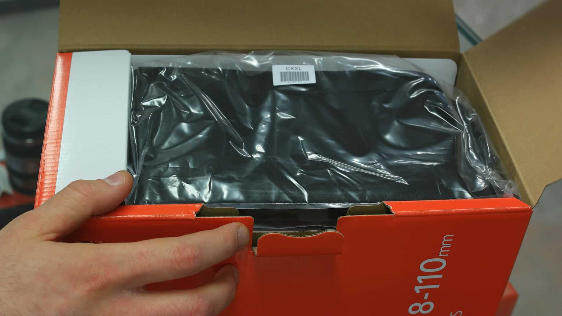 La confezione si apre sulla custodia in simil-pelle con fondo rigido, utile per evitare che il 18-110mm si graffi durante il trasporto; borsa che inoltre è abbastanza ampia da poter contenere l’obiettivo con il paraluce montato.