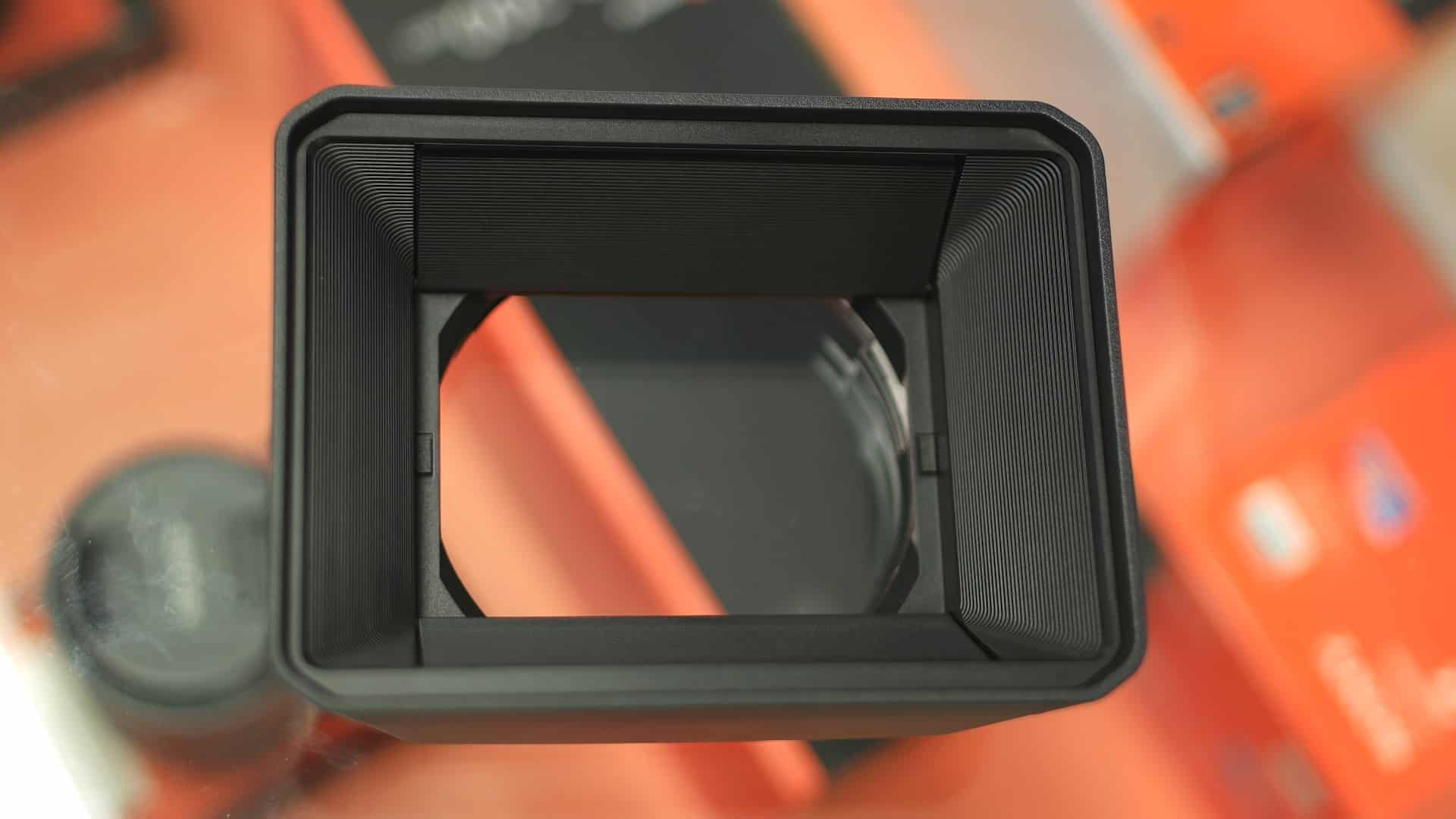 Paraluce che troviamo nel reparto sottostante, alla destra dell’obiettivo che è posto nella parte centrale della confezione. Ha una forma rettangolare, che ricorda quella dei matte box usati sulle videocamere professionali;